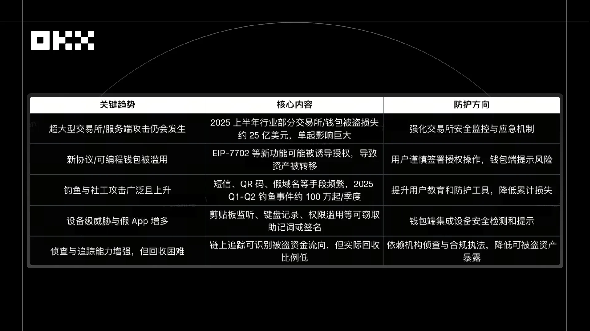 钱包安全侧的年度记录更具“入口战争”的意味。OKX Web3 安全年记披露,2025 年 1–11 月,安全体系累计帮助用户避免约 $500M 潜在损失,平均响应时间约 3 秒,并拦截约 $70M 高风险交易;内容同时提及设备风险检测、恶意链接识别与授权管理等能力迭代。若把其放入更宏观的安全语境中,文本试图回答一个行业痛点:当攻击从合约漏洞迁移到用户授权与钓鱼入口,钱包必须承担起“默认防护”的责任边界。