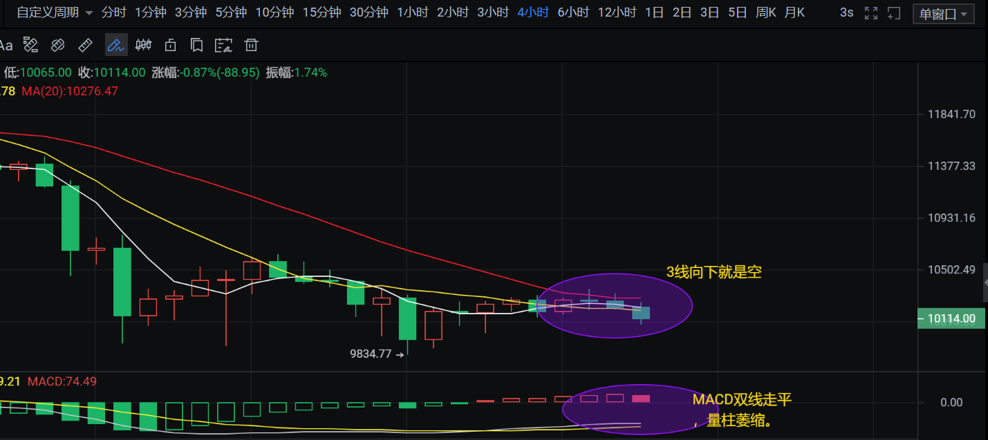 比特币的趋势如此明朗,制定计划就很简单了。上方20日线已经跟下来了,5、10日线重新向下拐头了,MACD量柱也向下萎缩了。照理来说在4小时图触碰到20日线回头且跌破5日线后就可以进空了,但考虑到一些没来得及做的,那就等待4小时收线,5日线来到10日线之下时,再回弹5日线附近进空吧。记住不要挂单进,同时做好损益计划。