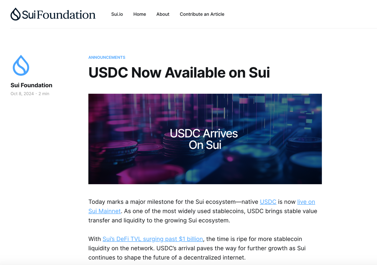 2024年10月,USDC(USD Coin)正式上线Sui区块链,为去中心化金融(DeFi)、跨链互操作性以及去中心化应用(dApps)的发展开辟了新天地。作为全球市值第二大的稳定币,USDC凭借其与美元1:1的锚定机制,成为区块链世界中最稳定且流行的数字资产之一。